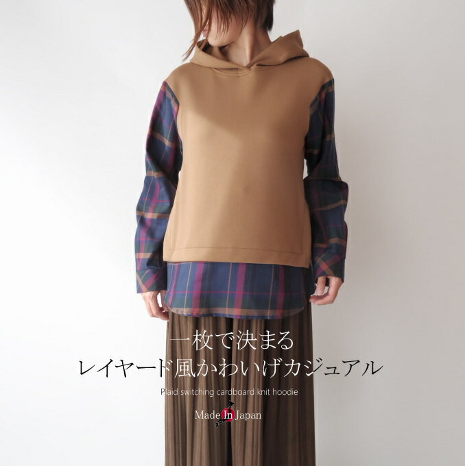 【日本製】上質ポンチジャージーチェック柄切替レイヤード風チュニックパーカー ミセス ファッション 50 代 40代 60代 70代 春 秋冬 綿 コットン アラフォー 母の日 プレゼント